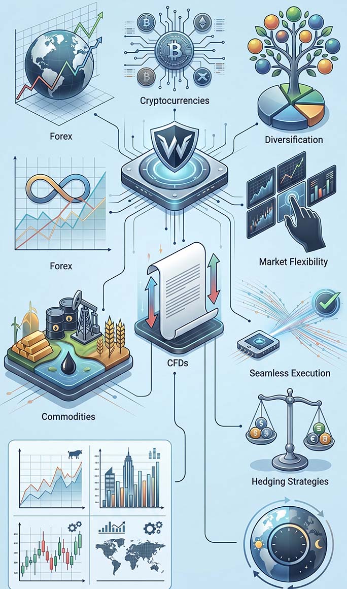 CFDs: Speculate on price movements without owning the asset via contract-for-difference instruments.